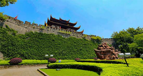 幽碧的爬山虎布滿斑駁的城垣墻面,陽光黏附在古老的墻磚與新綠的藤葉上,有一種世事滄桑話鳥鳴時的靜,瀟湘古閣,秦漢名城。